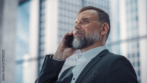 Confident Middle Aged Businessman in a Suit Standing in Modern Office, Answering a Phone Call, Looking Out of the Window on Big City with Skyscrapers. Successful Company CEO Planning Work Projects