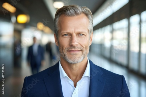 Confident Middle Aged Businessman in Blue Suit Standing in Modern Hallway Professional and Serious Expression Bright and Airy Lighting