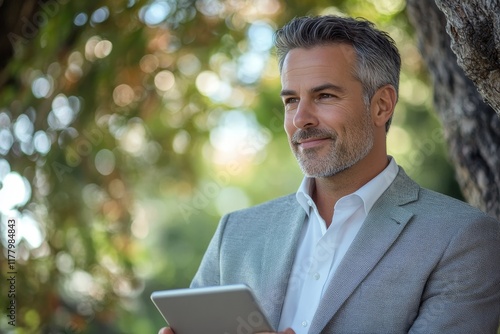 Confident middle aged businessman smiling while using a digital tablet in a professional setting