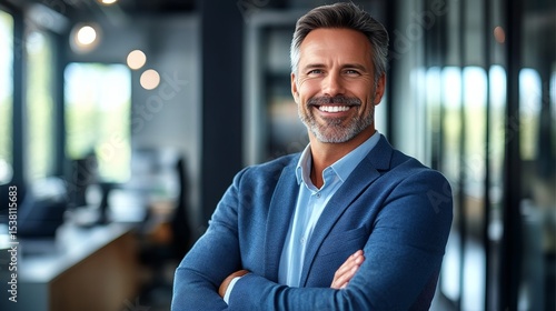 Confident Middle-Aged Lawyer Smiling in Modern Office, Light Blue Suit, Hands in Pockets