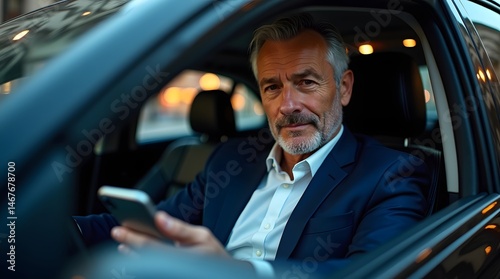 Confident middle-aged man enjoys a moment in his car, checking his phone while dressed in a sharp suit.