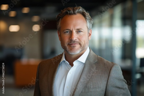 Confident middle-aged man in a brown blazer and white shirt smiling with a blurred modern office background