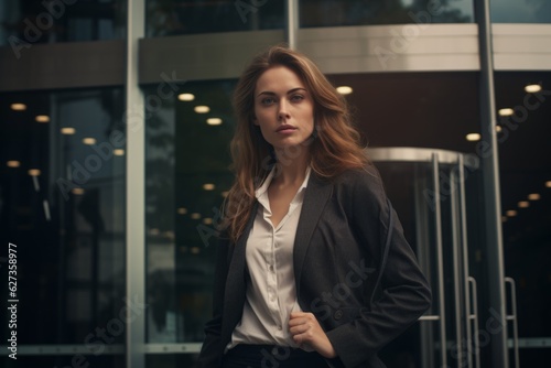 Confident modern worker girl manager business lady woman serious feminism businesswoman standing outdoors in front of office building entrance female employer financial specialist lawyer company CEO