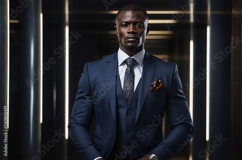 Confident portrait of an African American business man. A male executive, team leader, close up. Guy in stylish office suit blue. Male head of a company, CEO, boss executive