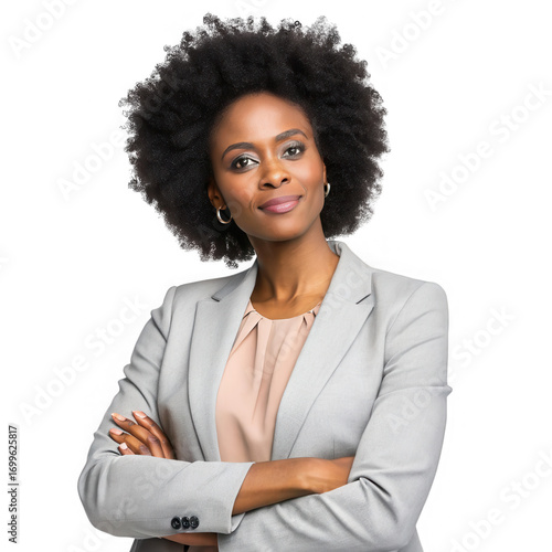 Confident professional black woman with voluminous hair and blazer arms crossed posed image