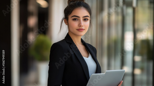 confident professional woman dressed in sleek tailored suit stands outside office building, holding tablet. Her poised expression reflects determination and focus