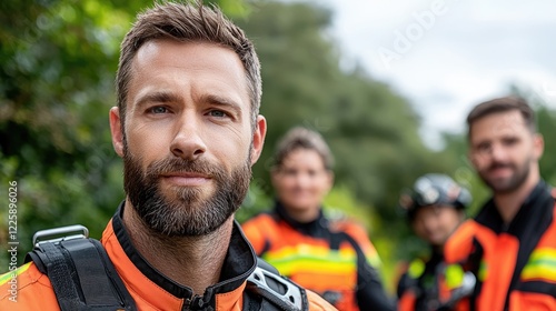 Confident rescue team leader, outdoors, emergency response, blurred background, safety