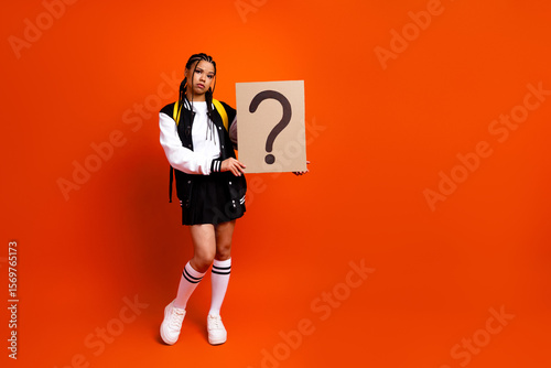 Confident schoolgirl holding a cardboard sign with a question mark in a stylish outfit and orange background