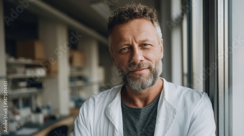 Confident Scientist Standing in Laboratory with Lab Coat, Engaging Expression, and Research Equipment in Background