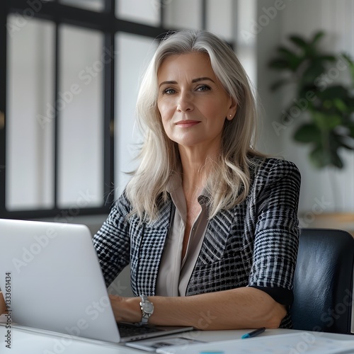 Confident Senior Business Woman with Gray Hair in Professional Suit at Her Desk in Office