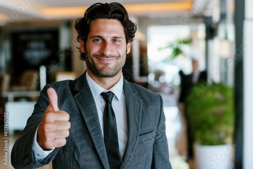 confident smiling businessman showing thumb up gesture in a modern office, success positive outlook concept