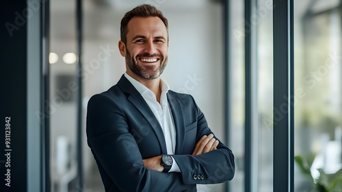 Confident smiling businessman standing with arms crossed in a modern office environment, wearing a suit jacket ove, embodying professionalism and corporate confidence