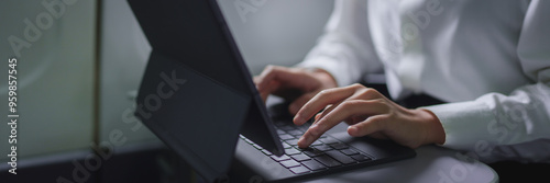 Confident successful Asian businesswoman sitting in airplane and working on laptop. Fly in first class In online business work in finance International business contacts business tourism.