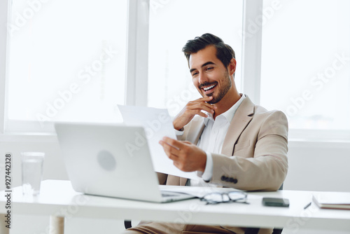 Confident suit laptop paper holding company businessman technology happy document planning office