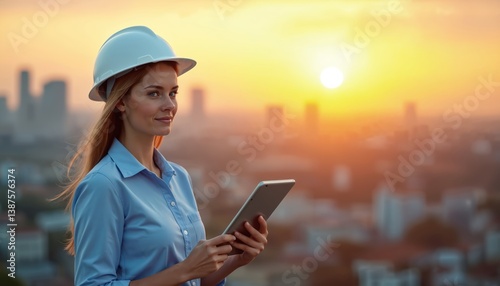 Confident woman engineer with tablet at sunset, cityscape in background. Female worker wearing hard hat, looking at tablet, planning, controlling construction project in evening. Technology,