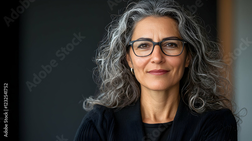 Confident woman, gray hair, glasses, dark background, portrait, business use