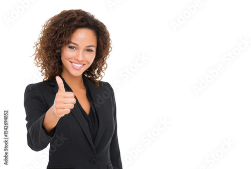 Confident woman in a professional suit giving a thumbs up. set against a clean white background. conveying positivity and success. ideal for business and motivational themes