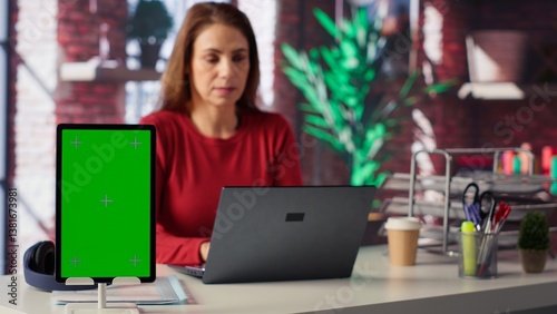 Confident woman solving tasks on a freelance platform next to mockup screen, answering emails and multitasking. Person staying connected and enjoying flexibility of working from home. Camera A.