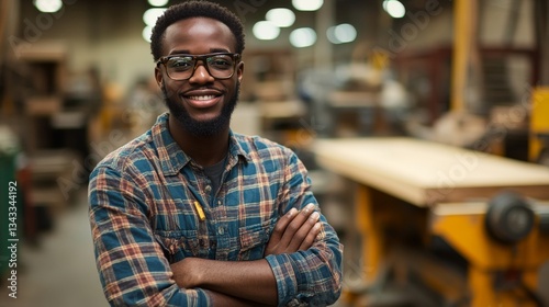 Confident Woodworker With Arms Crossed In A Workshop, Modern Carpentry And Manufacturing
