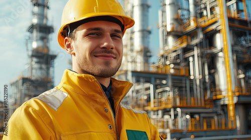 Confident Worker in a Yellow Hardhat Stands Before a Refinery