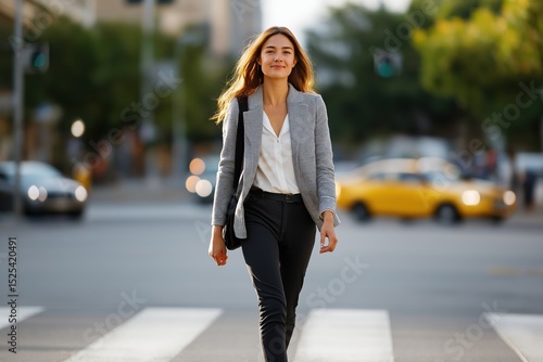 Confident young adult caucasian female walking across urban crosswalk
