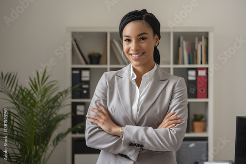 Confident young African-American businesswoman posing in the office, smiling and looking professional in a professional setting
