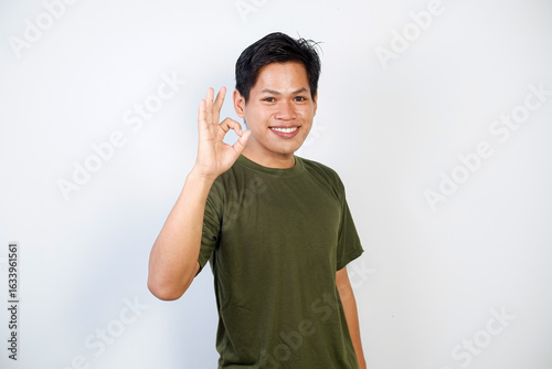 Confident Young Asian Man Smiling While Making an OK Gesture Against White Background.