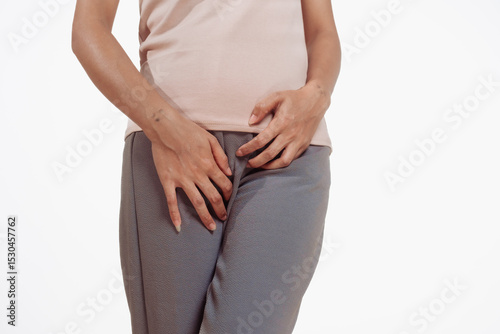 Confident young Asian woman in light brown shirt stands against a white background, experiencing vaginal pain. inflammation, cysts, endometriosis gynecological conditions affecting female health.