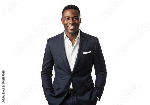 Confident young black man in suit smiling and standing hands in pockets studio portrait isolated on transparent background