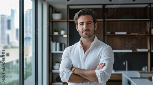 Confident young businessman in a modern office setting, arms crossed, with a professional yet approachable expression.