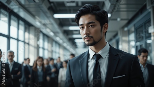 Confident Young Businessman in Suit Strolling Through Modern Office Environment with Colleagues