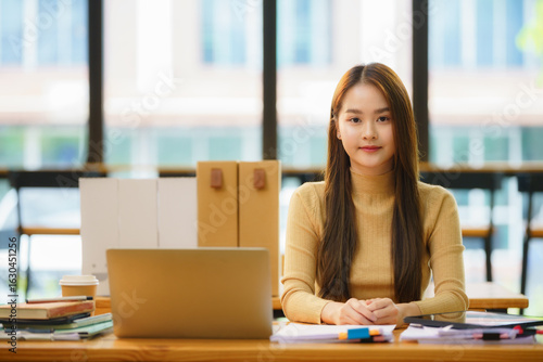 Confident young businesswoman looking at the camera while sitting at her workspace.