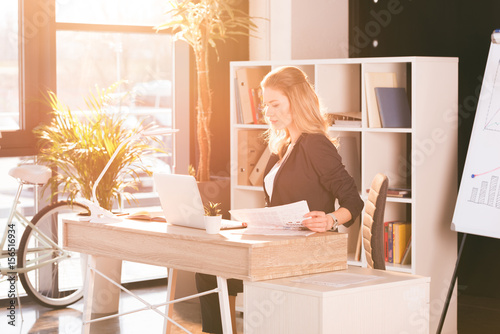 Confident young businesswoman using laptop and holding papers at workplace