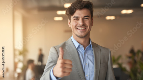 Confident young Caucasian man in a suit giving a thumbs up in a modern office setting, showcasing positivity and professionalism.