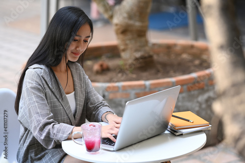 Confident young female entrepreneur working with laptop computer and provides online marketing service at cafe.