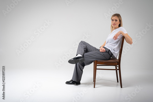 Confident young girl sitting on a chair on a light background, wearing a white t-shirt and a wristwatch. Modern minimalist portrait perfect for business or lifestyle themes, space for inscription