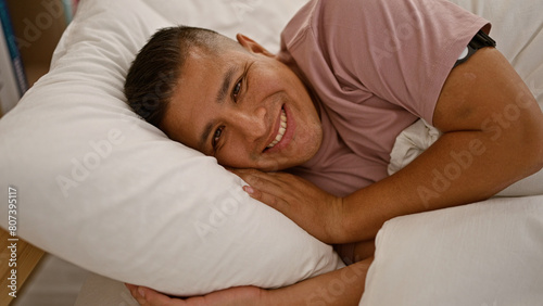 Confident young latin man blissfully relaxing, lying in bed, sporting a cheerful smile in the cozy ambiance of his comfortable bedroom.