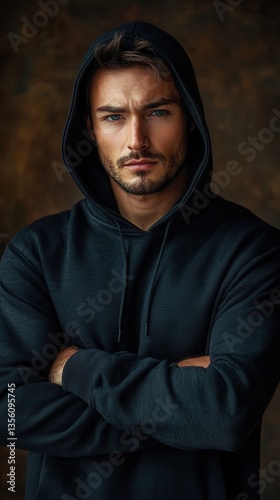 Confident Young Man in Black Hoodie with Serious Expression Posing Against a Dark Textured Background for Fashion or Lifestyle Photography