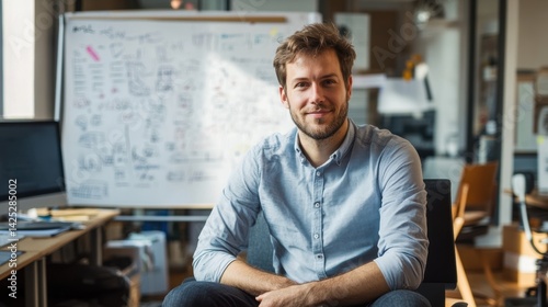Confident Young Man in Modern Office Setting, Portrait of a Successful Business Professional at Work