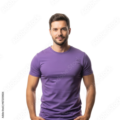 Confident young man in purple t-shirt posing for a portrait shot transparent background