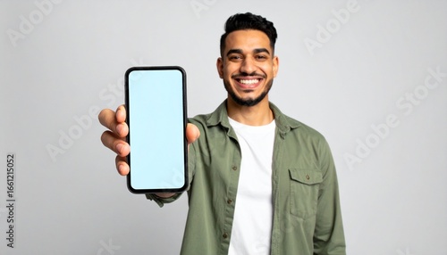 Confident young man presenting a smartphone with a blank display, ideal for showcasing new apps, digital content, or communication concepts, embodying modern tech interaction.