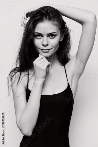 Confident young woman showcasing her natural beauty, with long hair and a playful expression. Black and white portrait emphasizing emotion and elegance.