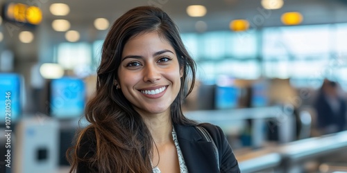 Confident Young Woman Smiling at Airport Check-in Counter