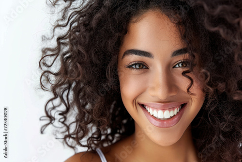 Confident young woman with curly hair smiling at camera. Beauty and confidence.