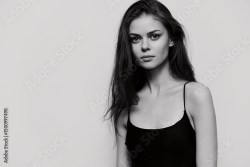 Confident young woman with long hair posing on a simple gray background, wearing a black tank top, showcasing natural beauty and elegance.