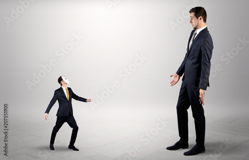 Conflict between small masked businessman and big elegant businessman