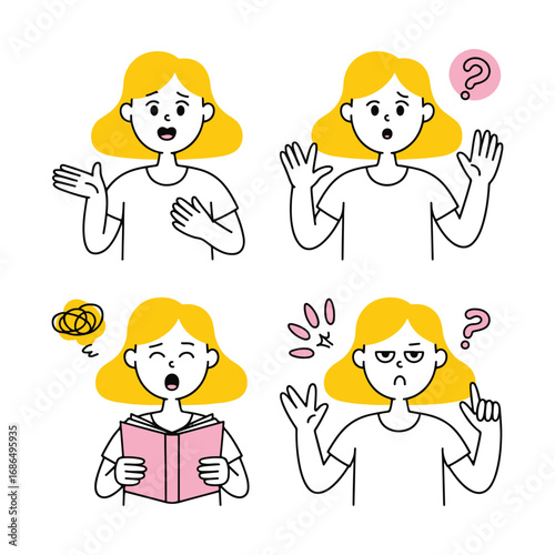 Confused and Thinking Woman with Book and Gestures in Flat Vector Illustration