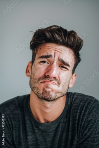 Confused Man in Casual Clothing, Staring Upward with Furrowed Brows