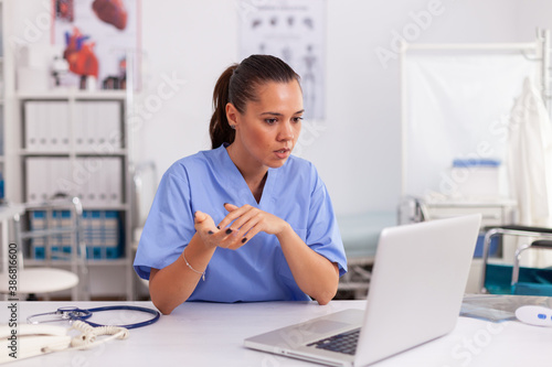 Confused medical practitioner in hospital office while working on laptop. Health care practitioner sitting at desk using computer in modern clinic looking at monitor, medicine.