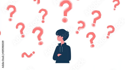 Confused Young Man Surrounded by Colorful Question Marks Representing Curiosity, Doubt, and Uncertainty in Life or Decision-Making Process